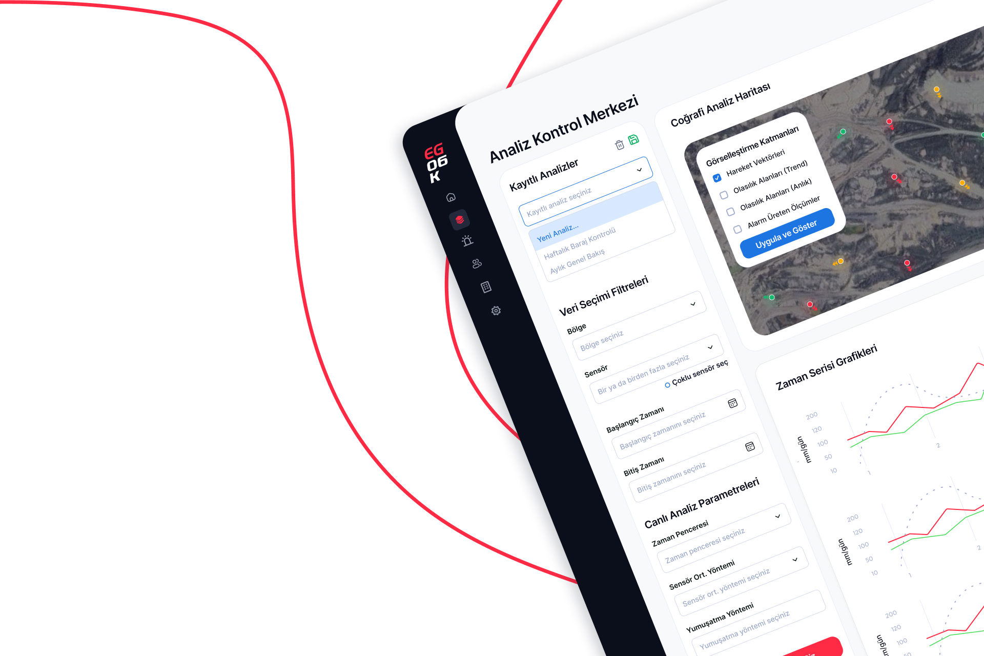 Analiz modülü, seçilen sensörlerin veya bölge bazlı grupların vektörel davranışlarını, hız, ivme ve yer değiştirme değerlerini grafiksel olarak sunar. Temel düzeyde alarm üretme kabiliyetine sahip olan sensör verileri, genişletilebilir algoritmik bir yapı sunmasa da, grafiksel gösterimler ve özel hesaplama parametreleri ile desteklenerek sahadaki hareketlerin detaylı takibine olanak tanır.